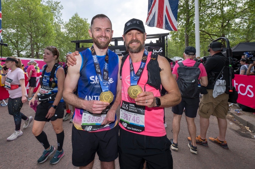 Caption: Anthony Bryan (left) and Tyler Slade (right) at the 2025 TCS London Marathon Finish Line
